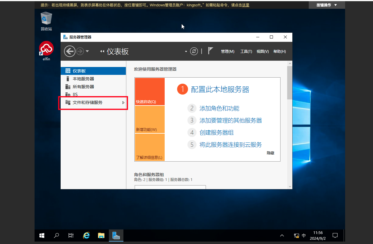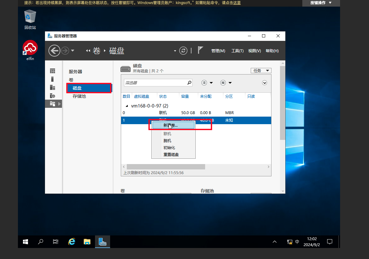 1.找到 开始 > 服务器管理 > 文件和存储服务 > 卷/磁盘 的路径进入磁盘管理。
