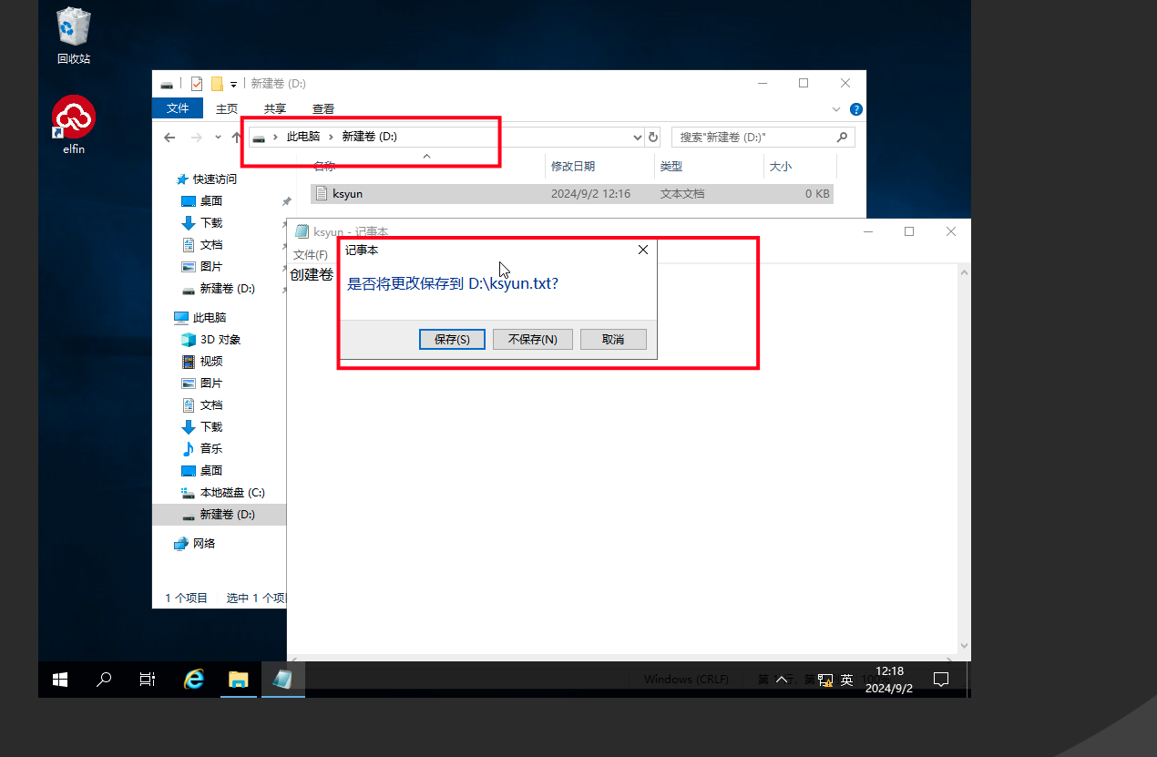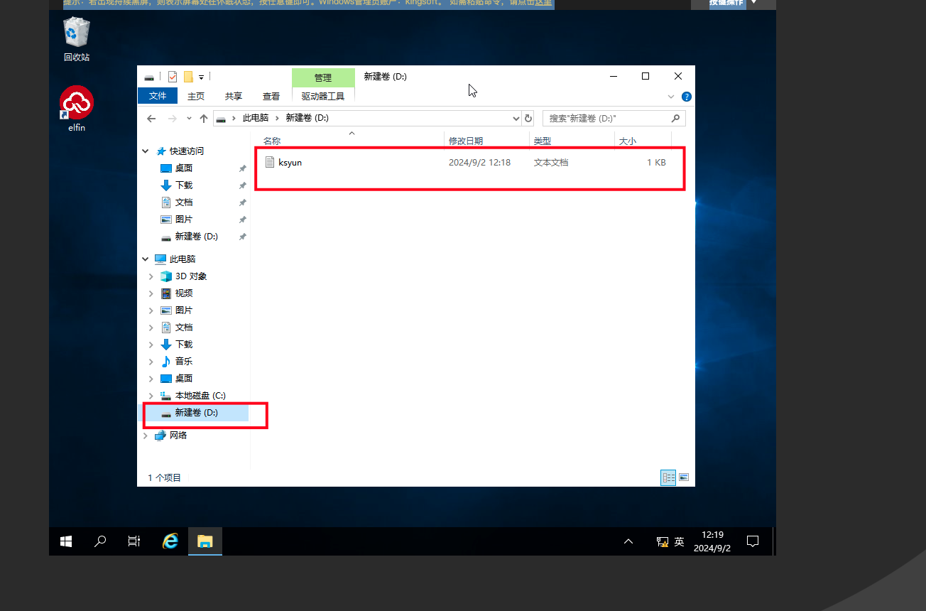 5.进入创建的盘中,新建一个名为 ksyun.txt 的文件,输入您需要的内容,执行保存操作。即完成写入文件操作。