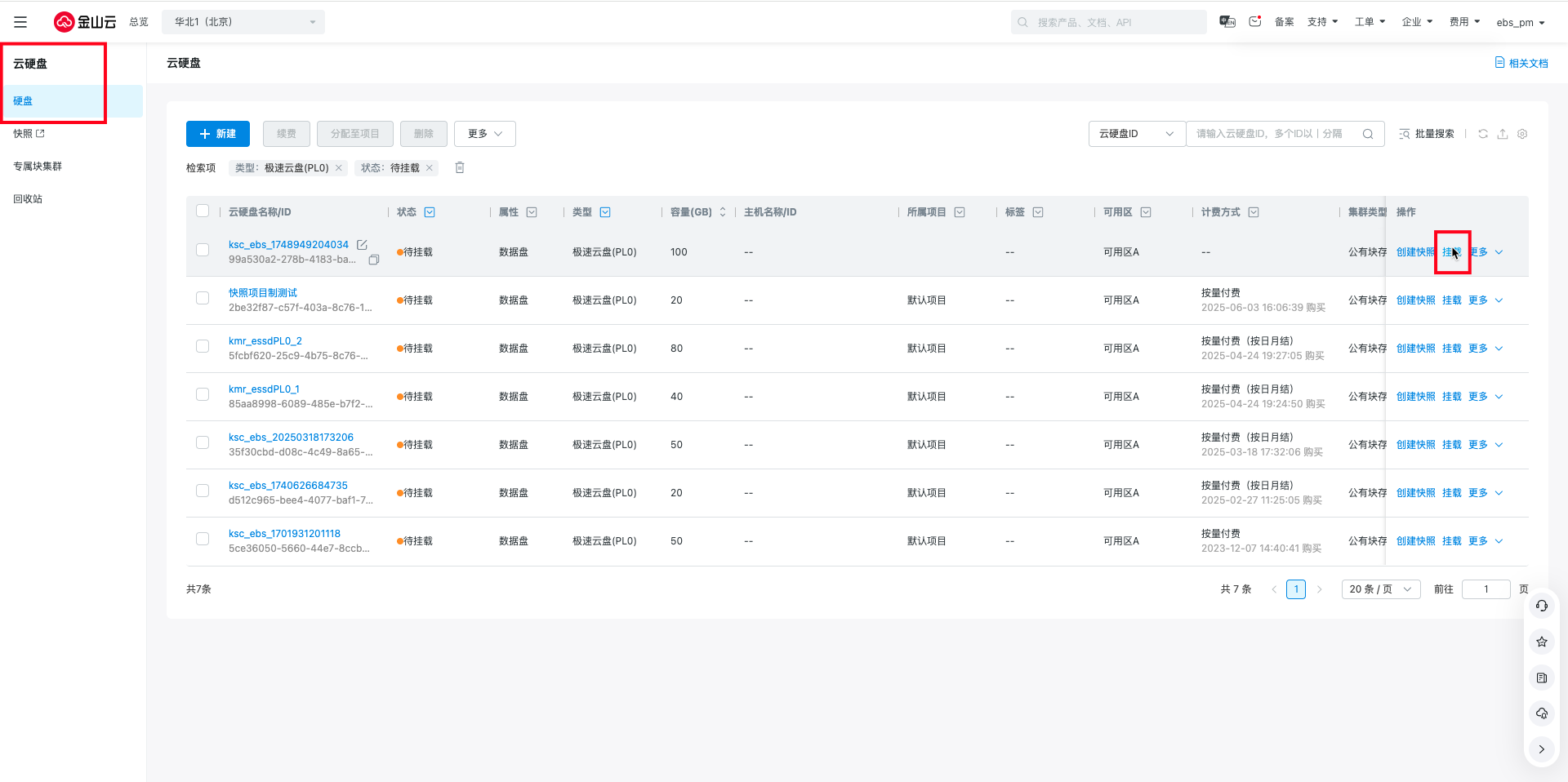 4.购买完成后您可以在云硬盘列表页查看已购买的云硬盘,并显示为待挂载状态。