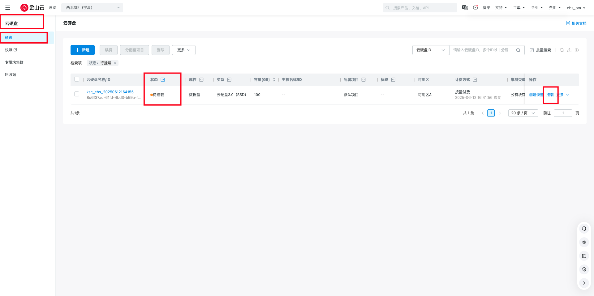注意:目前支持对作为数据盘的云硬盘进行挂载,不可挂载系统盘。