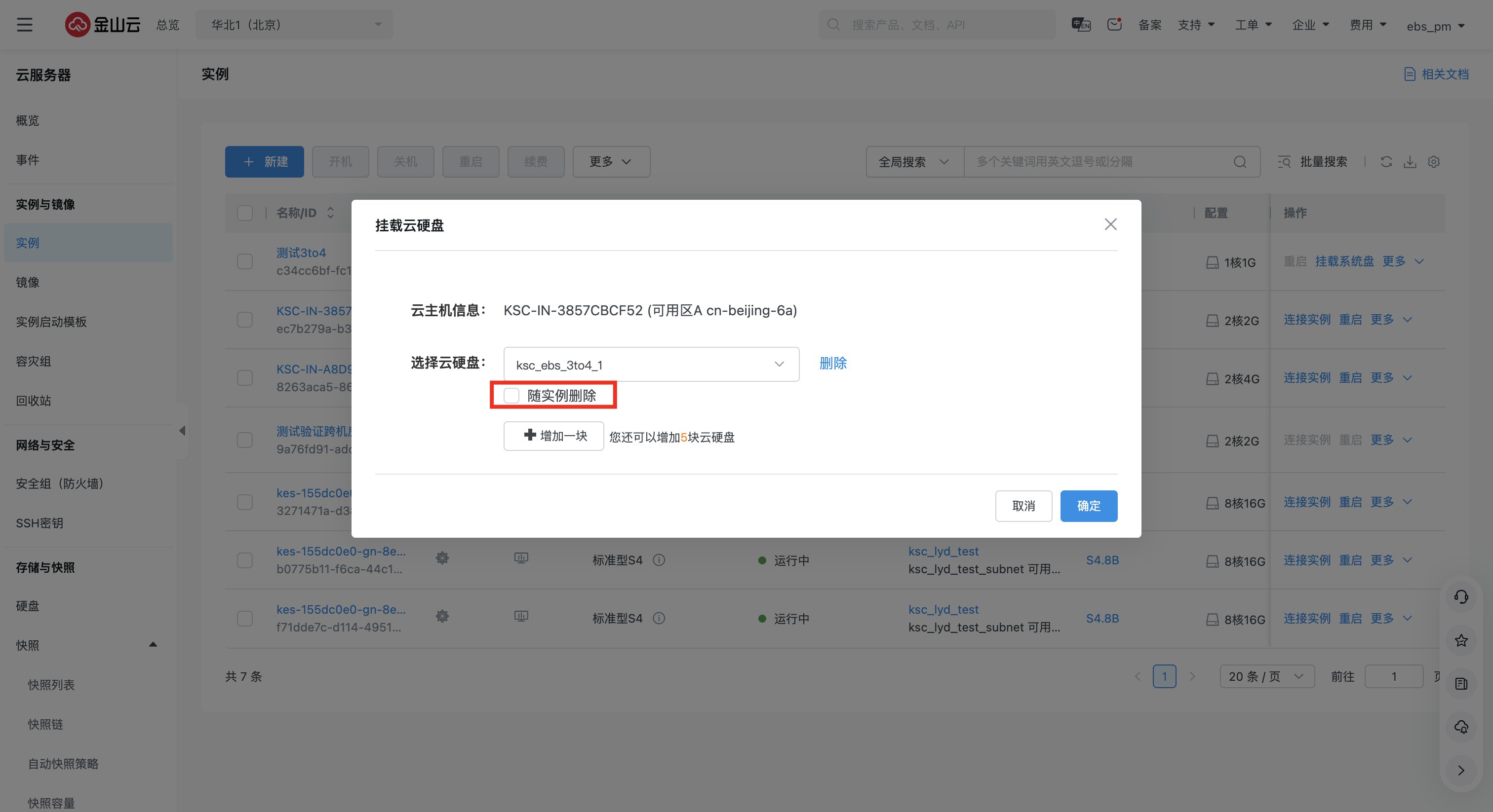 选择需要挂载的云服务器,可以选择云硬盘是否随云服务器一起删除,如选择,删除主机资源后,云服务器附属的云硬盘也会一同删除。设置后点击确定即可。