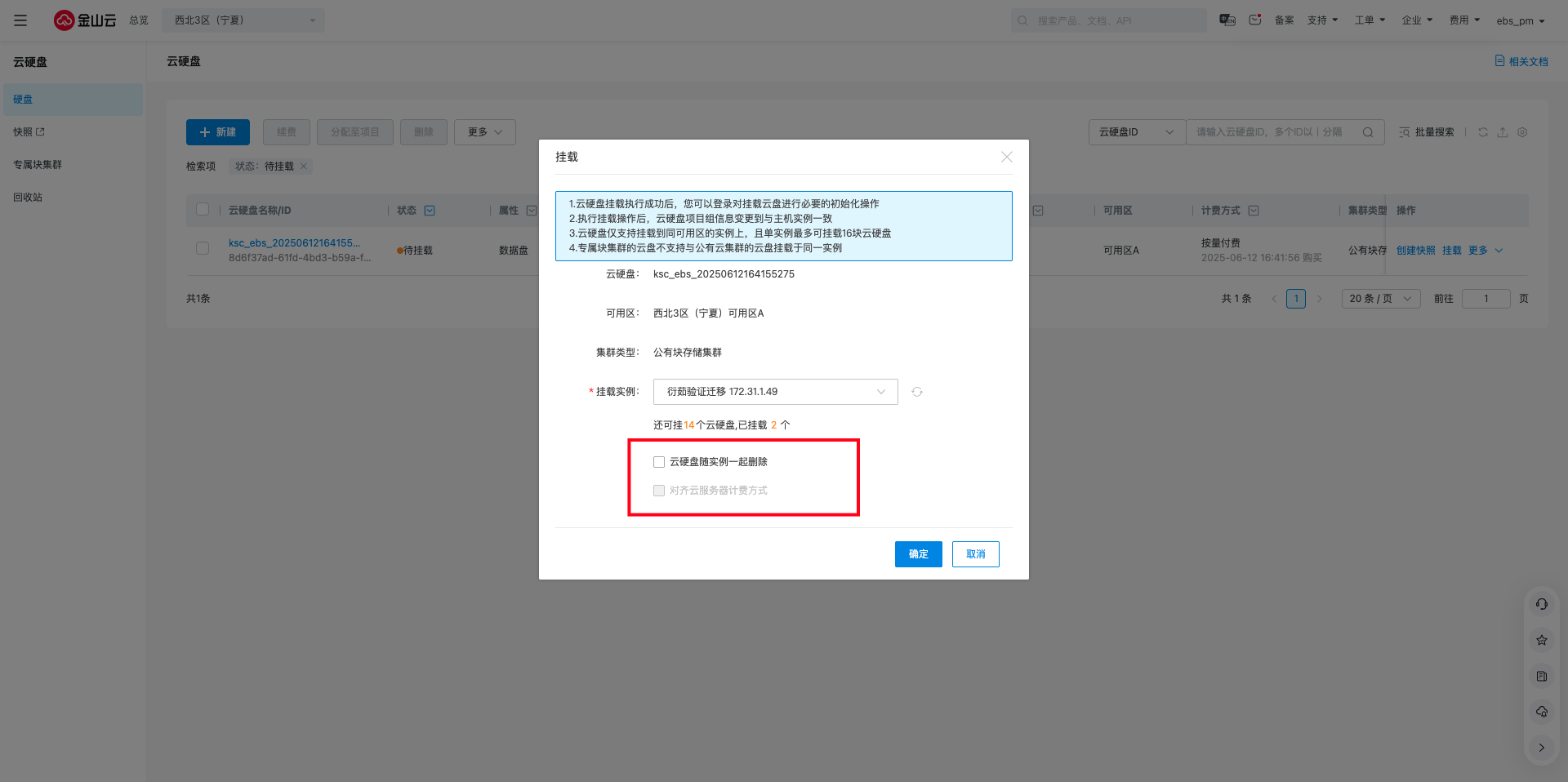 选择需要挂载的云硬盘,可以选择云硬盘是否随云服务器一起删除,如选择,删除云服务器资源后,云服务器附属的云硬盘也会一同删除。设置后点击确定即可。