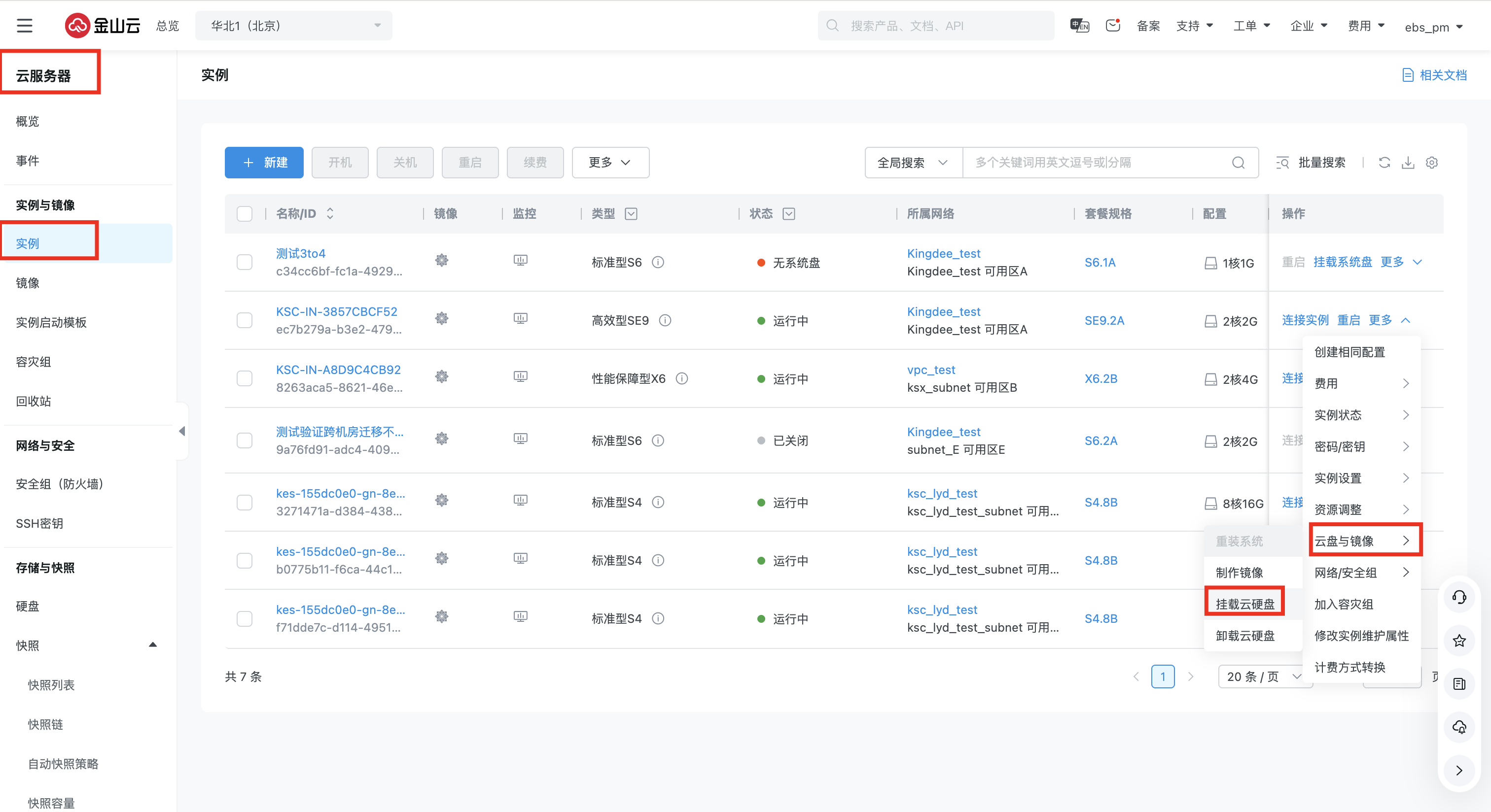 在云服务器实例列表页,点击更多>云盘与镜像,在下拉列表中选择中的挂载云硬盘。