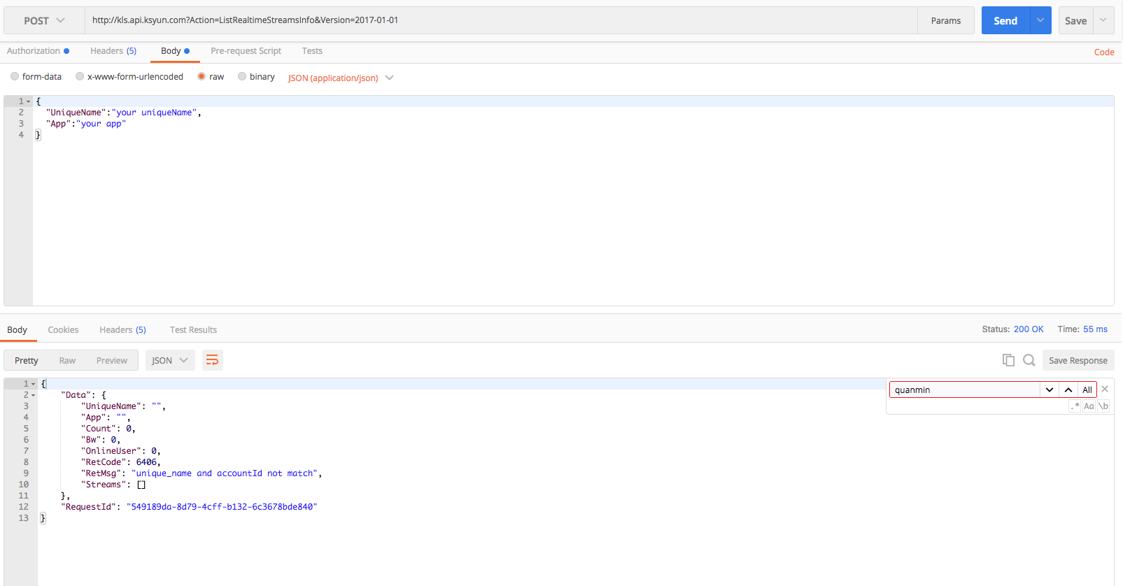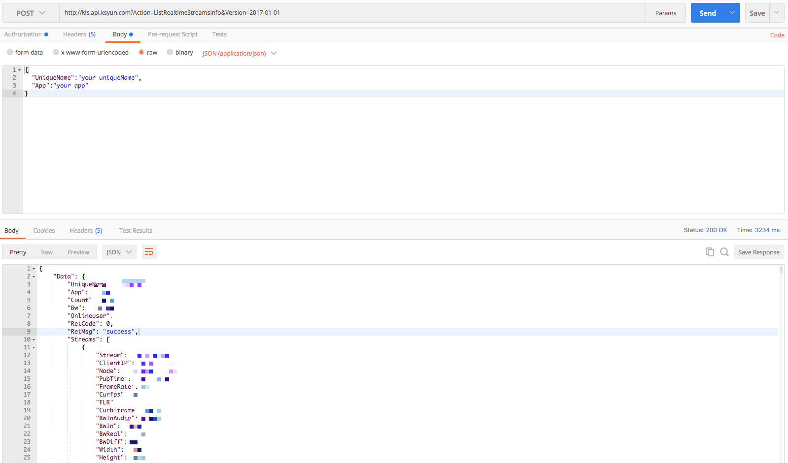 建议正式使用接口前,先用Postman进行调试,本文以调用ListRealtimeStreamsInfo为例,为您演示: