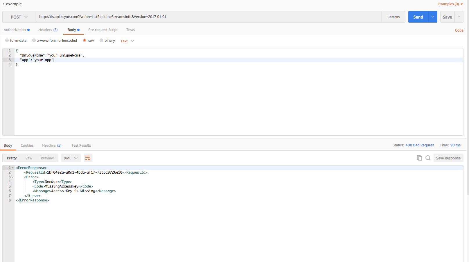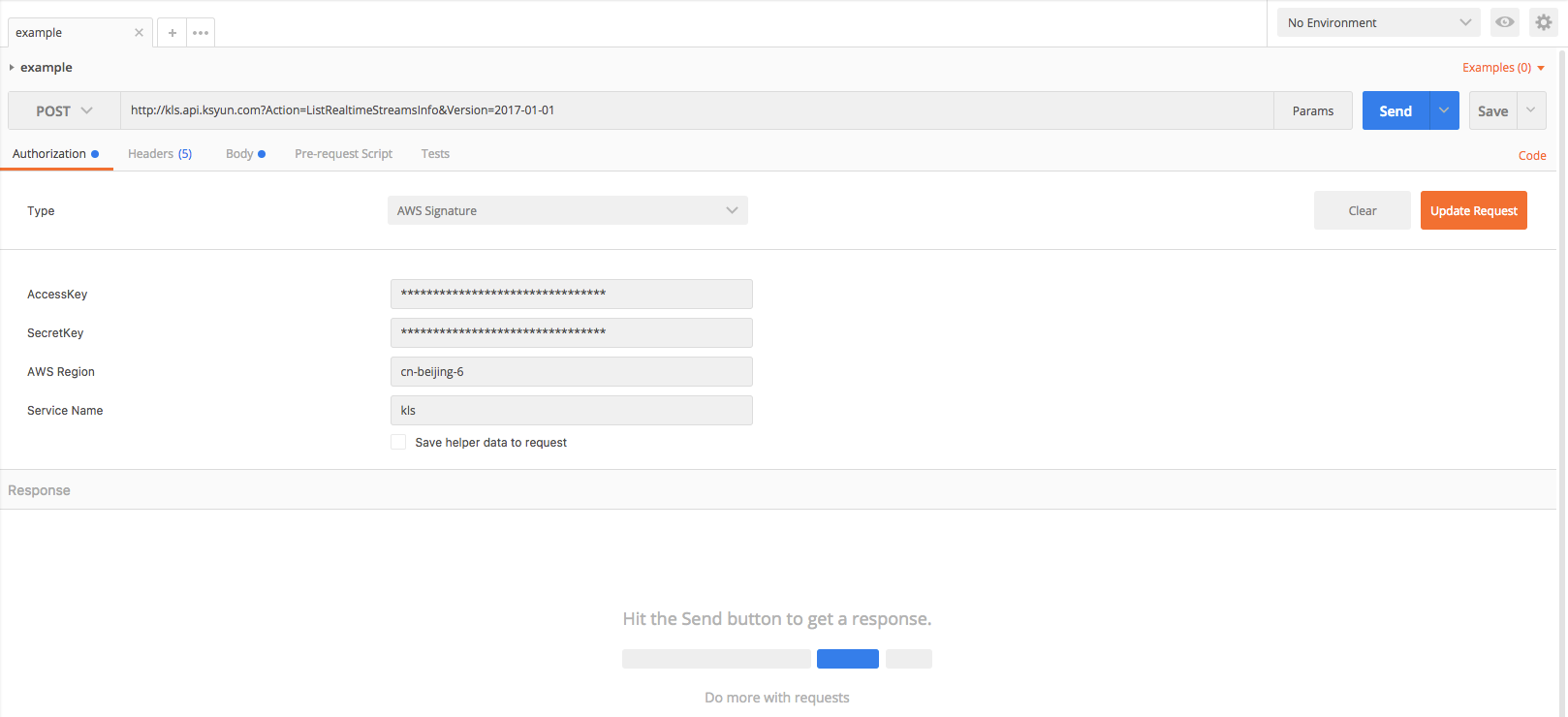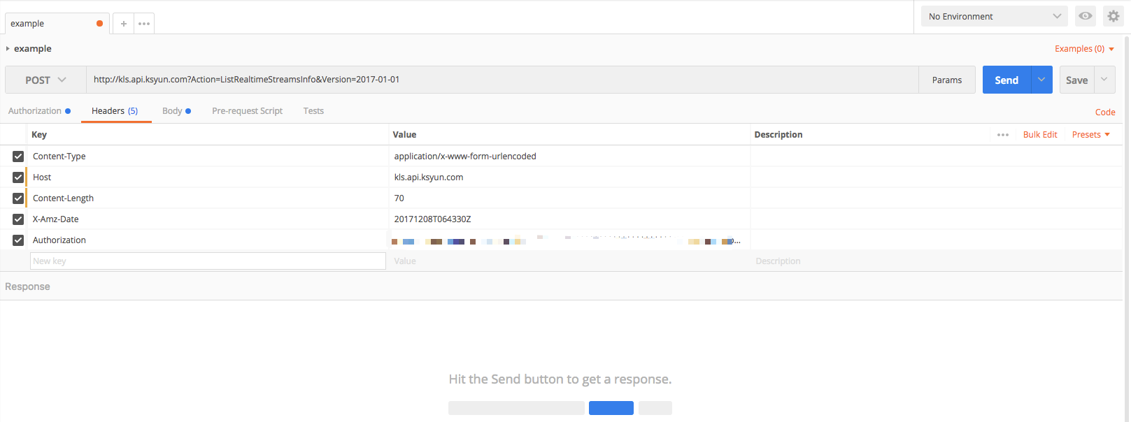 1.打开Postman,请求方法设置为Post, 在请求URL中填入 http://kls.api.ksyun.com?Action=ListRealtimeStreamsInfo&Version=2017-01-01