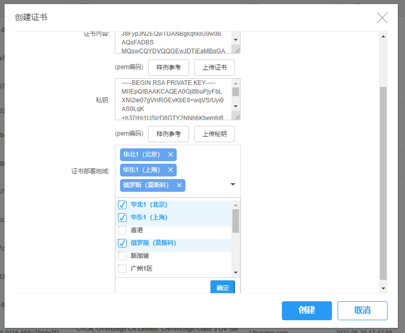 以下为证书格式和证书链格式范例,请确认格式正确后上传: