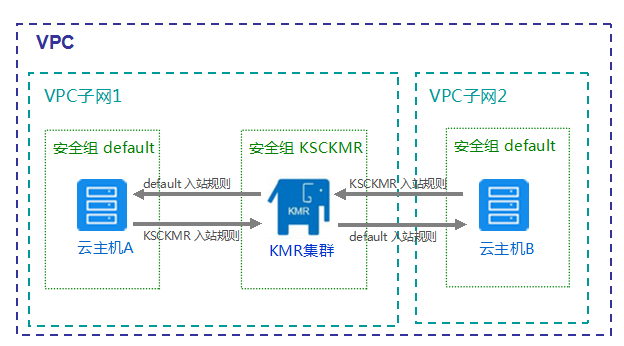 KMR采用云主机(Kingsoft Cloud Elastic Compute,简称KEC)构建集群,二者服务都依托于VPC,创建于用户指定的VPC网络和VPC子网中,VPC具有安全组功能,将VPC中的产品划分不同的安全域,为每个安全域定义不同的访问控制规则。KMR集群默认安全组为“KSCKMR”,集群内部各节点在该安全组内可相互访问。每个云主机在创建时也会绑定唯一的安全组,默认为“default”,在同一VPC下,处于相同或不同子网的KMR集群和云主机可通过配置安全组规则进行互通。