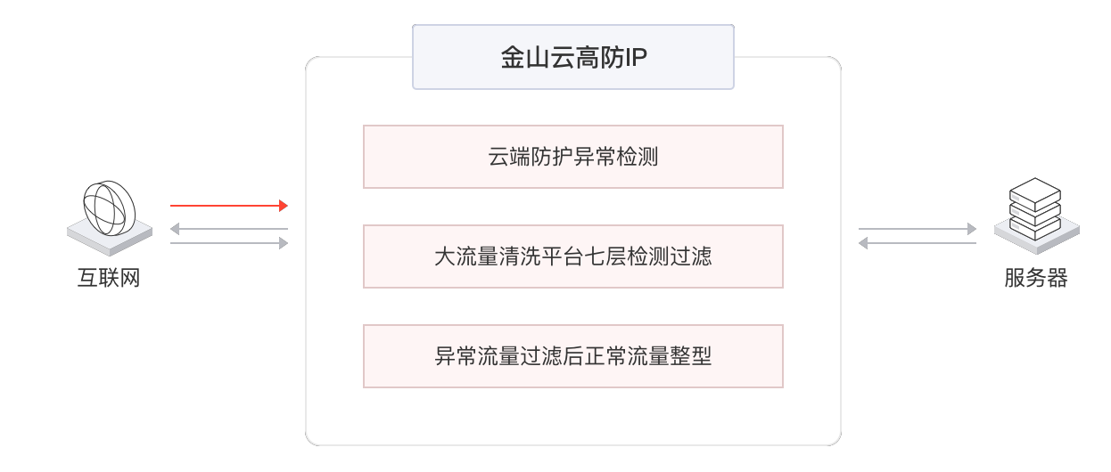 - 金山云高防IP在云端对DDos攻击进行防御清洗,通过防护算法拦截攻击流量,将正常流量转发回源,高拦截率算法确保攻击能够被有效拦截,保障业务实时在线。