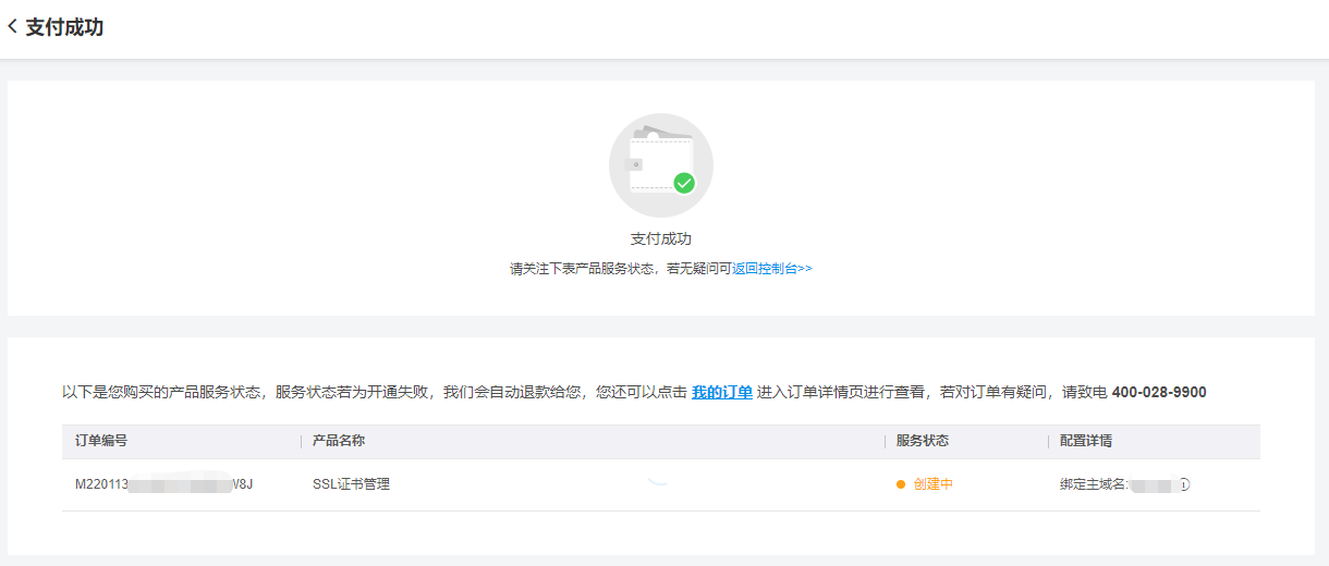 支付成功后,在证书成功签发前,服务状态均会显示为创建中。
