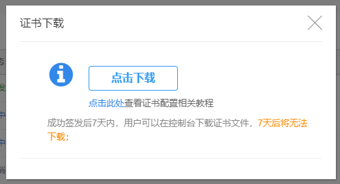 在弹窗中点击点击下载按钮,即开始下载证书文件。