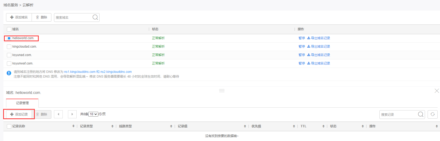 为了让高防的配置生效,需要用户在自己的域名服务提供商处修改DNS解析记录,此处仅以金山云DNS作为样例,用户可以参考此步骤修改,或是咨询自己的域名服务提供商。