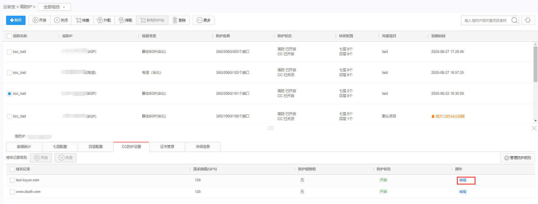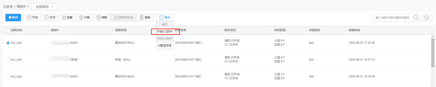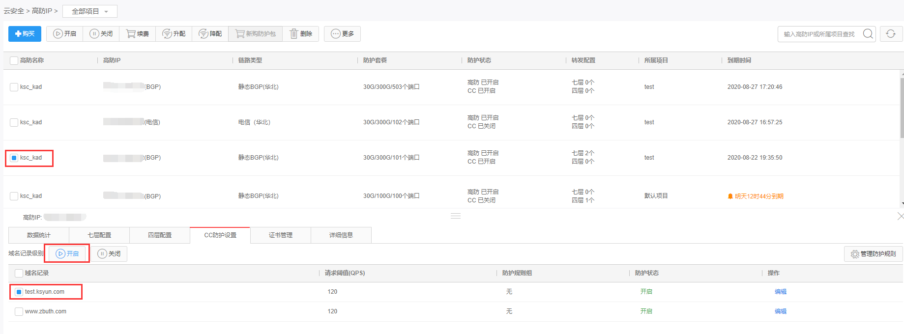注意:请确定高防IP的状态为“开启”,且CC防护状态为“开启”