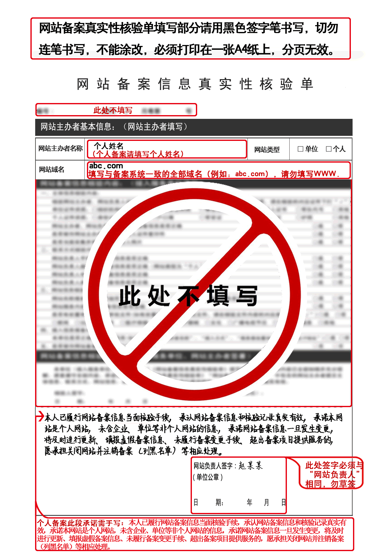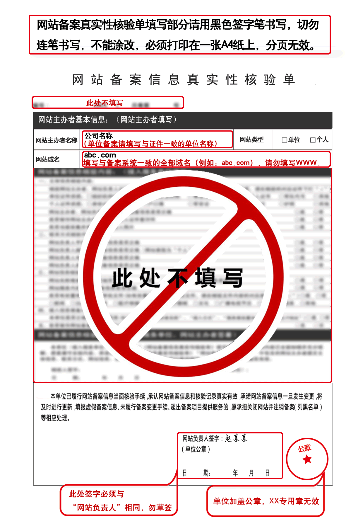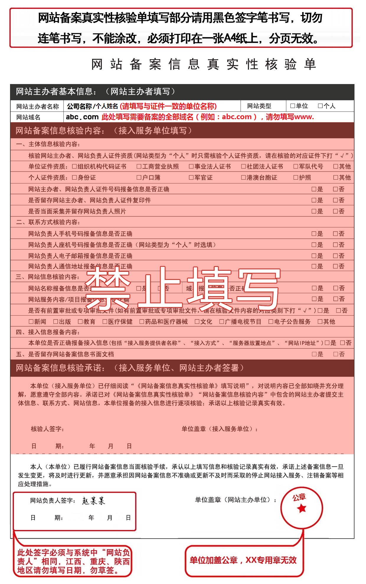 核验单只需要用户填写最上方的单位名称及域名信息以及最下方的网站负责人处签字盖章即可,日期不需填写。