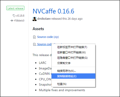 从 Github下载CAFFE的对应发布版本,下载地址如下: https://github.com/NVIDIA/caffe/releases, 选择【Source code (tar.gz)】。