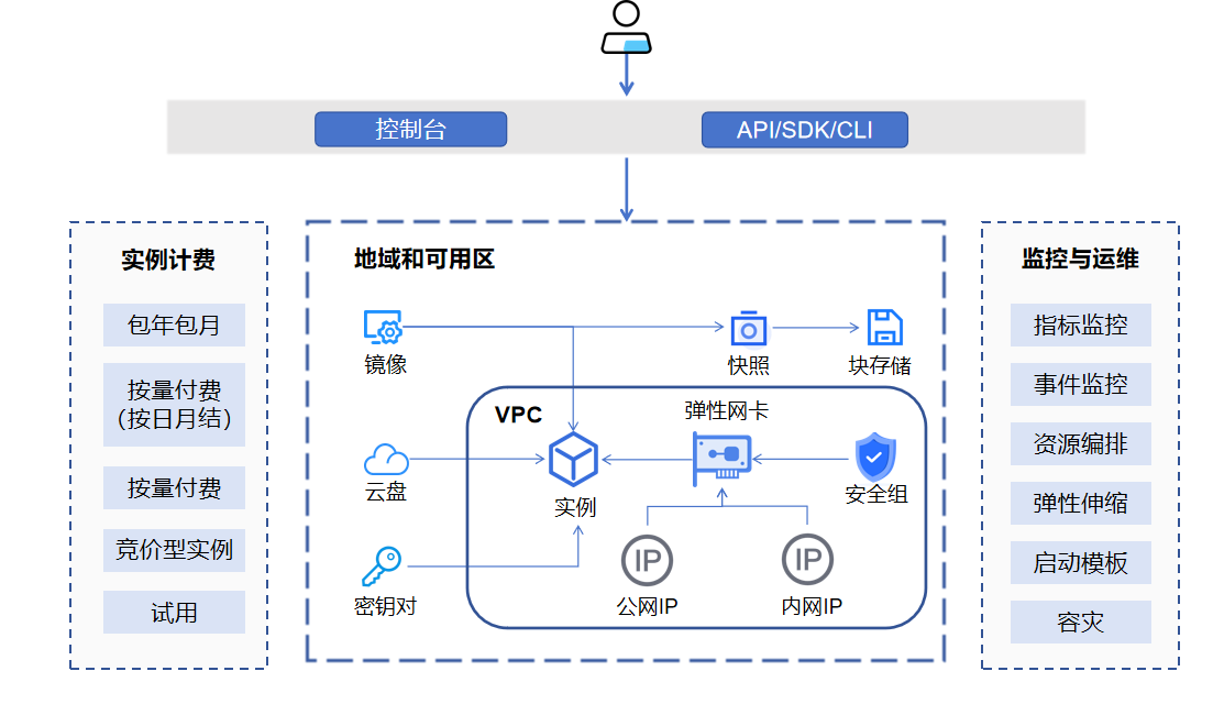 等同于一台虚拟机,能提供高性能的计算资源,包含CPU、内存、操作系统、网络等基础的计算组件。 | |