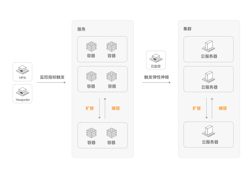 金山云容器服务可以根据服务的负载情况自动进行扩/缩容,当服务负载较高时,自动进行服务扩容并秒级部署,响应并发请求;在服务负载较低时,在不影响线上服务的前提下自动执行缩容,节约资源成本。全程不需要人为干预,为您免去人工部署的负担。