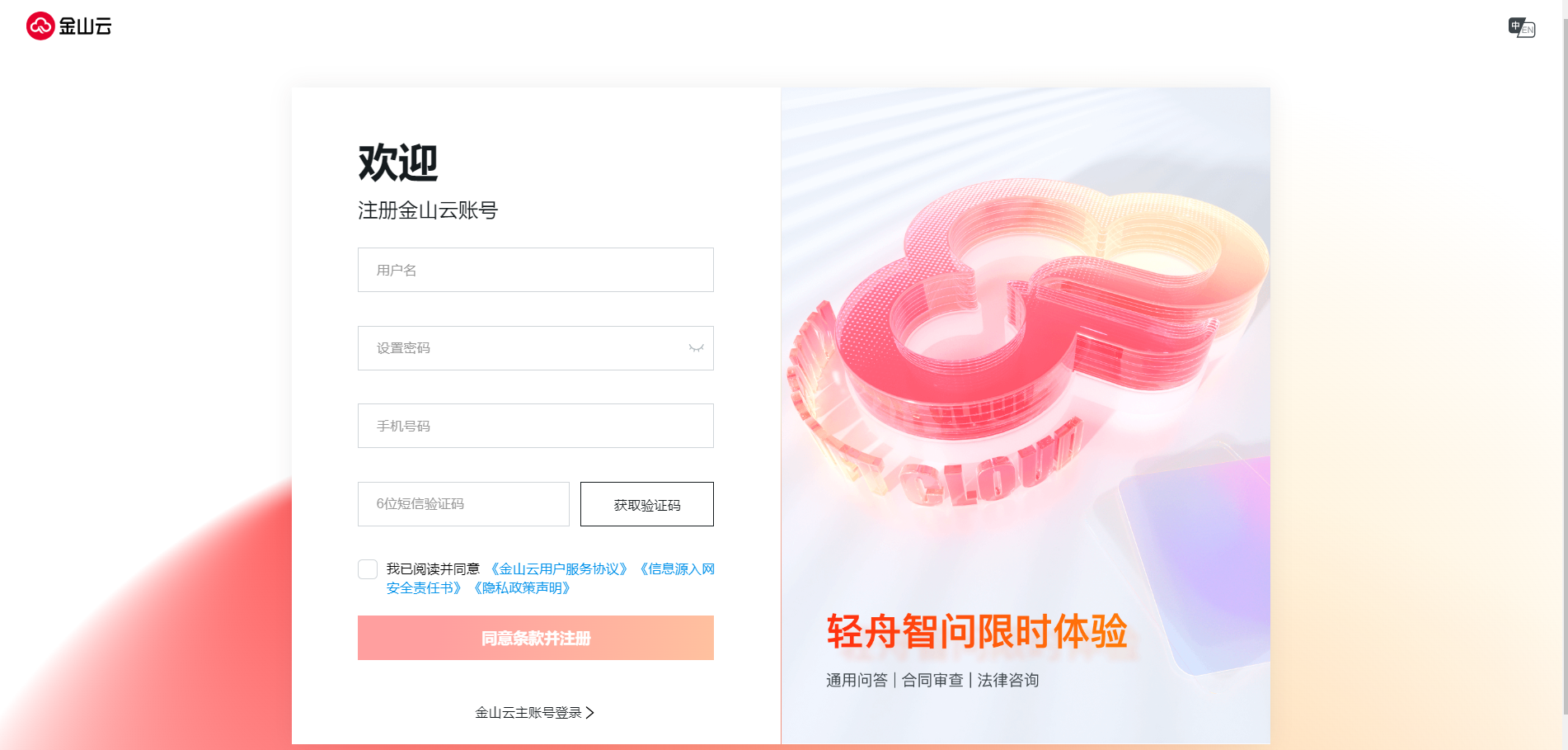 1.访问金山云官网,单击页面右上角 注册 按钮,前往注册页面。