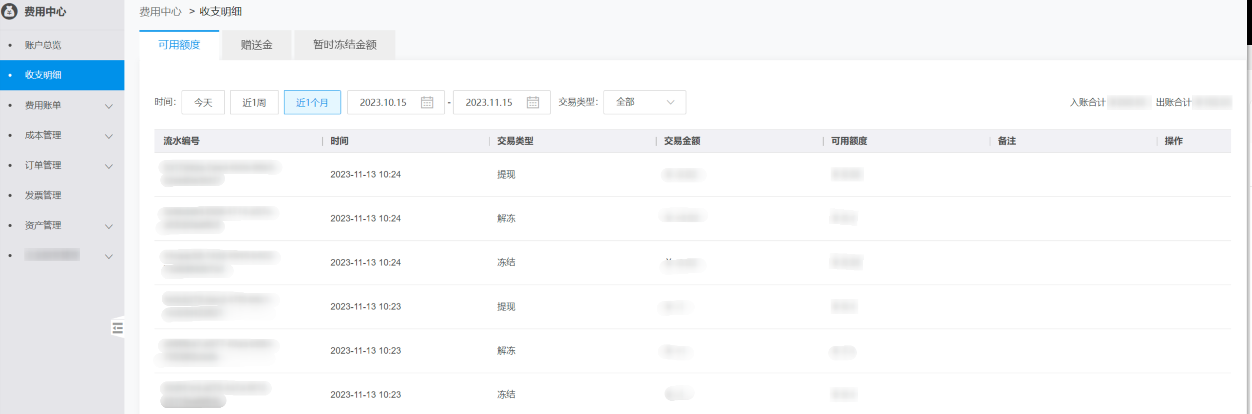 收支明细用来记录您的账户每一笔资金的收入和支出的流水,比如充值、退款、消费、提现、调账、冻结、解冻等。您可以通过收支明细功能查询账户资金的明细变化记录。