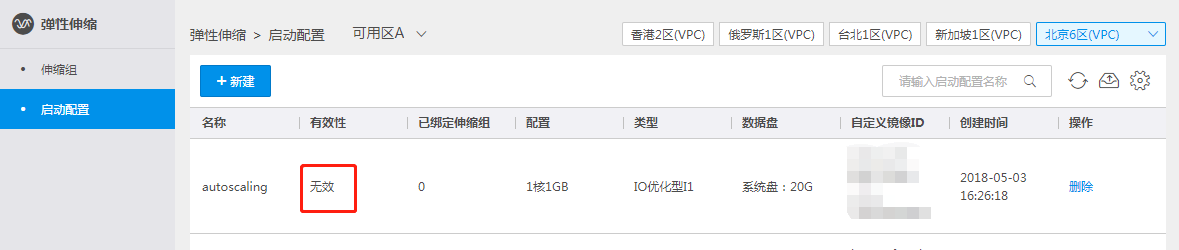 您可直接在启动配置列表中查看,如下图所示,若有效性显示为无效,说明您的启动配置中镜像已被删除,导致不可用。