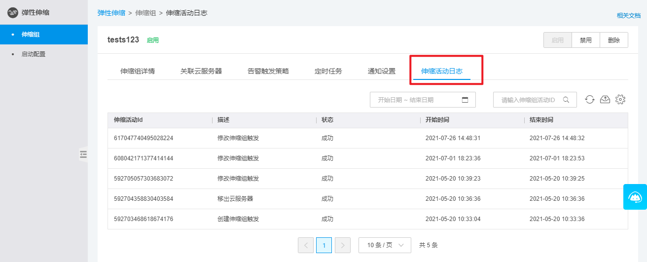 本节介绍如何查看伸缩活动日志。在弹性伸缩详情页面中的”伸缩组“页签上,用户可以在伸缩组列表中对伸缩组完成更多的管理操作。