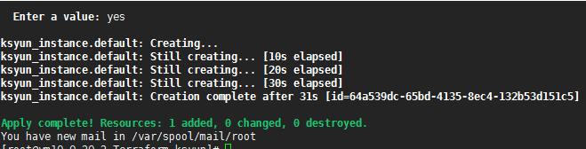 执行 terraform plan 查看部署计划,这里参数前面的+代表新添加的资源,当销毁资源时,参数前面对应的符号会变为-;更改一些参数需要重新部署资源时,该资源前面的符号为-/+。