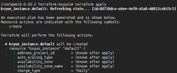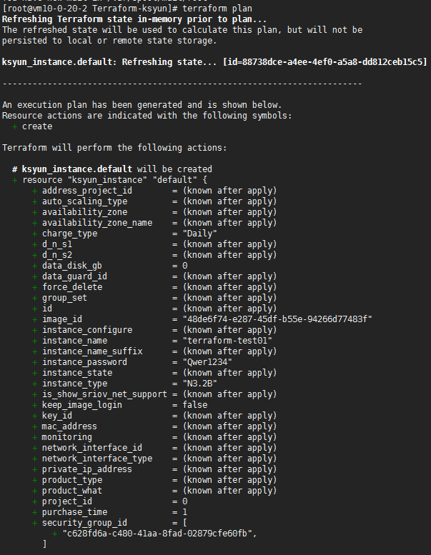 执行 terraform plan 查看部署计划,这里参数前面的+代表新添加的资源,当销毁资源时,参数前面对应的符号会变为-;更改一些参数需要重新部署资源时,该资源前面的符号为-/+。