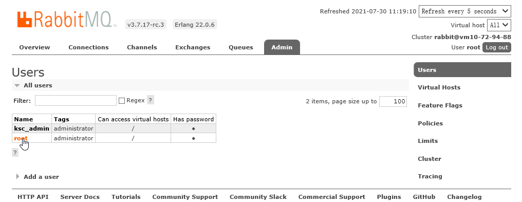 - 登录云服务器,在云服务器浏览器中输入在RabbitMQ实例详情页面获取Web端地址,输入您创建RabbitMQ时的账号及密码,账户名默认为root,若您忘记密码可以在RabbitMQ控制台重置密码。