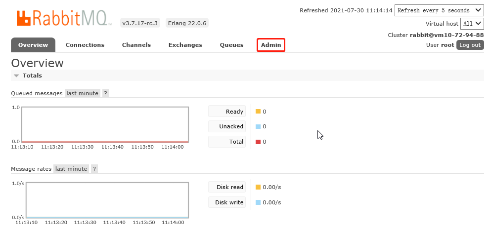 - 在RabbitMQ管理页面,点击Admin,进入用户管理页面。