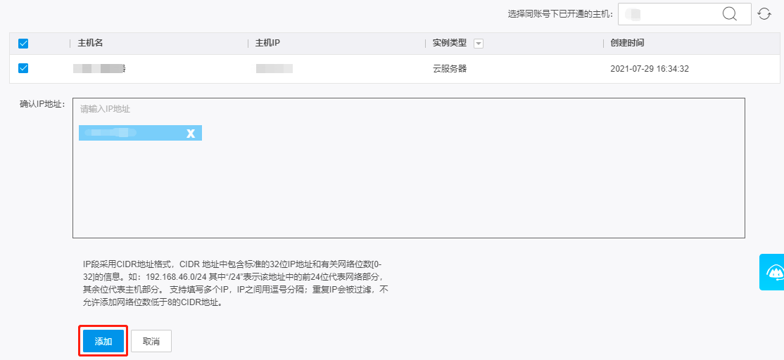 - 选择您的云服务器,勾选后点击添加将服务器内网IP添加进实例安全组。