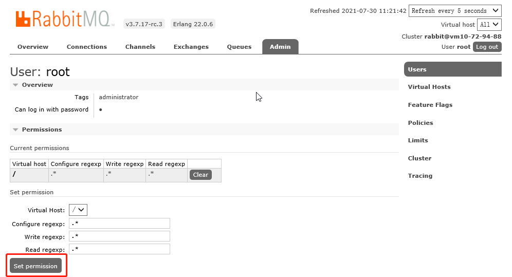 - 在Permissions子标签下按照默认配置,点击Set permission,拥有权限后即可操作Queue和Message。