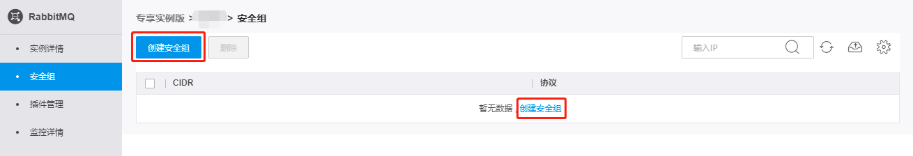 - 准备一台与RabbitMQ实例相同VPC的Windows服务器,在实例详情页左侧安全组页签,点击创建安全组。