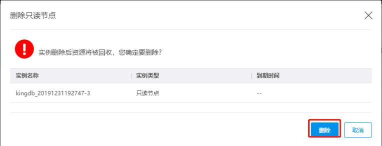 第三步: 点击删除,确定删除只读节点,或点击取消,取消删除只读节点。