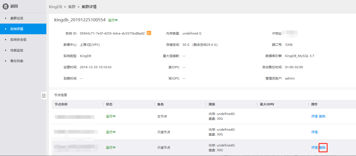 第一步: 点击实例详情页面中的只读节点的操作:‘删除’
