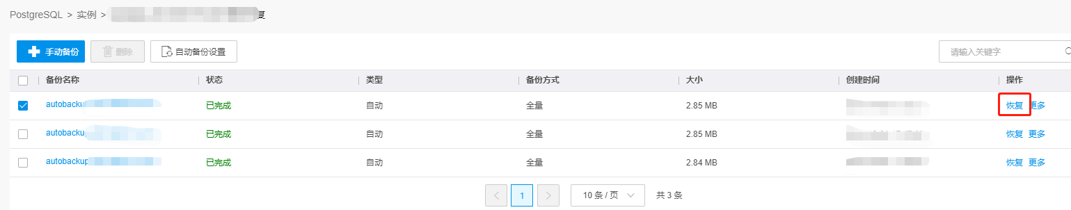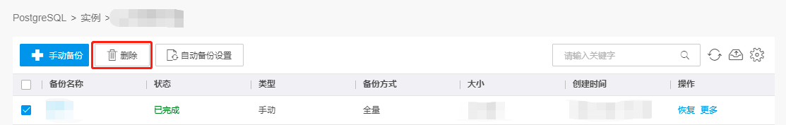在PostgreSQL实例详情页左侧导航栏中点击备份恢复,勾选某1个或者多个手动备份文件,点击删除。