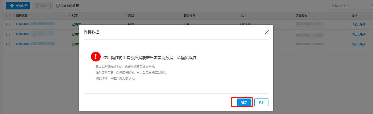 注意:手动备份期间无法对实例进行重启、升级操作,且一个实例的手动备份最多有五个。