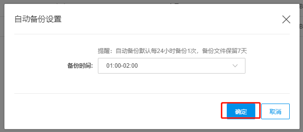 点击自动备份设置,设置自动备份时间,系统默认选取3:00-4:00,默认自动备份保留时间7天。