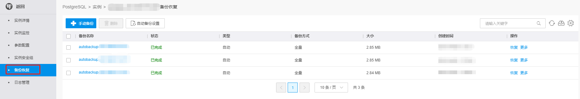 在PostgreSQL实例详情页左侧导航栏中点击备份恢复,进入备份页面。