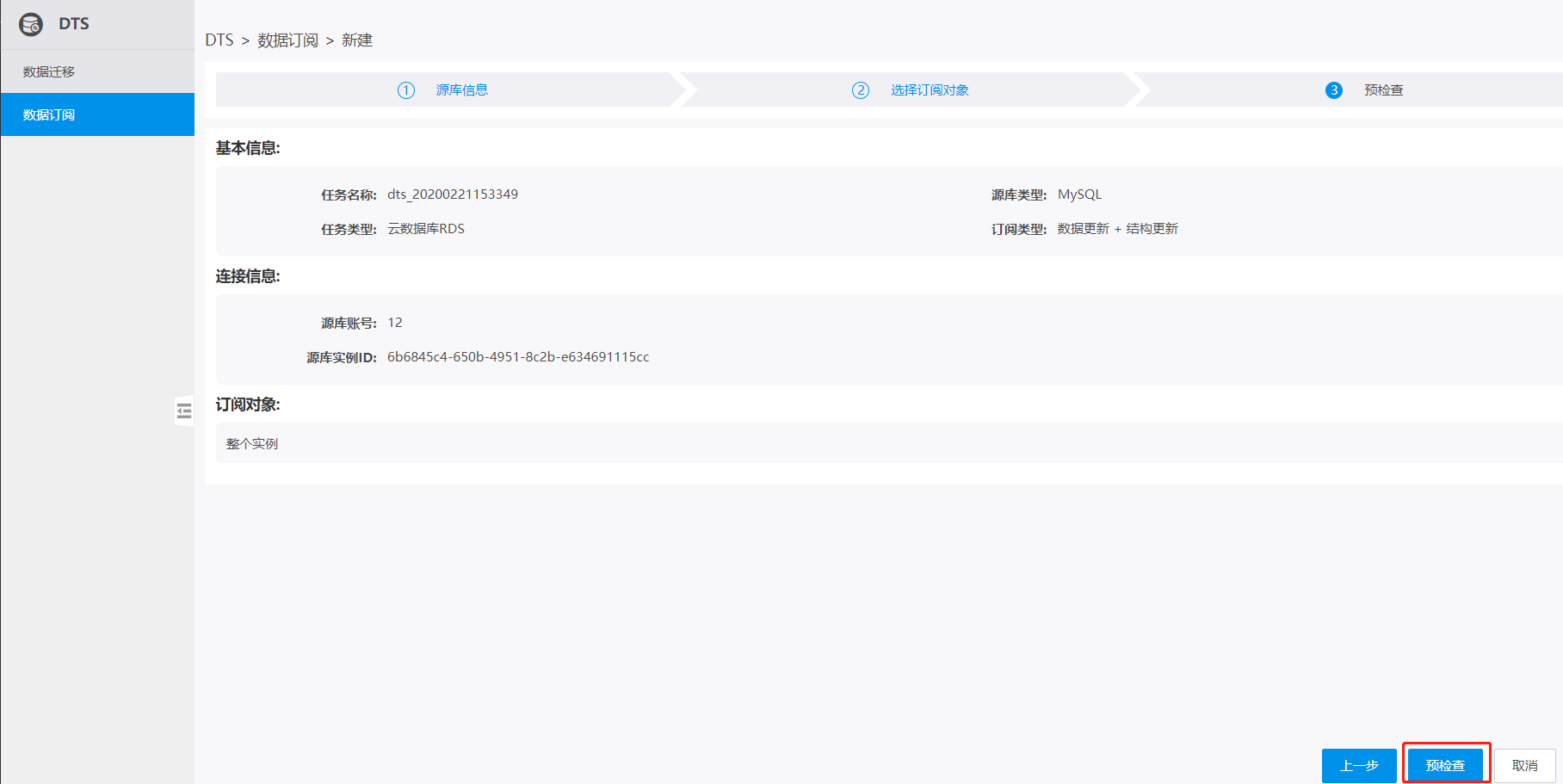 预检查完成后,数据订阅任务即创建完成,之后可进行新建消费组Kafka客户端消费订阅数据的操作