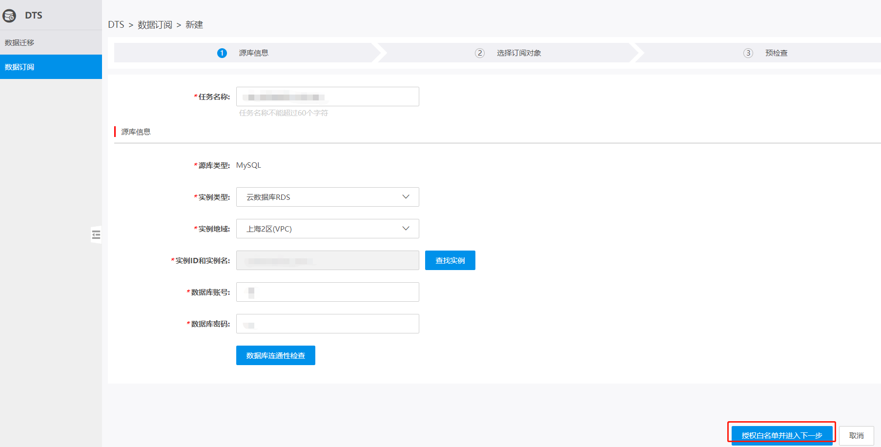 4.配置订阅任务的源库信息