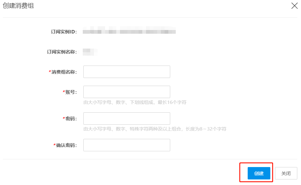 在弹出的创建消费组对话框,设置消费组信息。