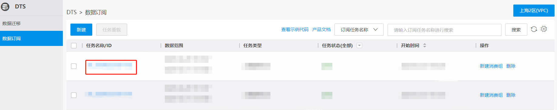 在订阅任务列表中,单击订阅任务名称/ID