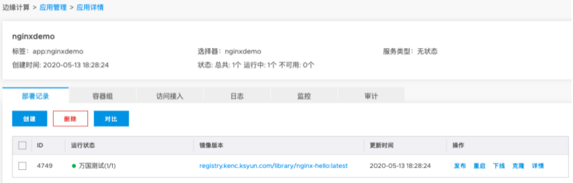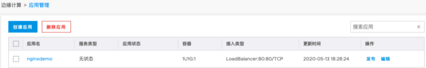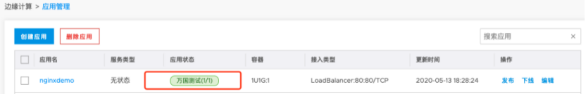 (2)应用创建:应用创建即为应用上线的过程,“发布”操作指将指定的镜像以及相关联的访问接入、存储资源等发布到边缘节点上,成为运行中的容器,同时向外暴露容器的访问。如果是通过负载均衡暴露出来的访问方式,即可访问负载均衡下对应的容器。