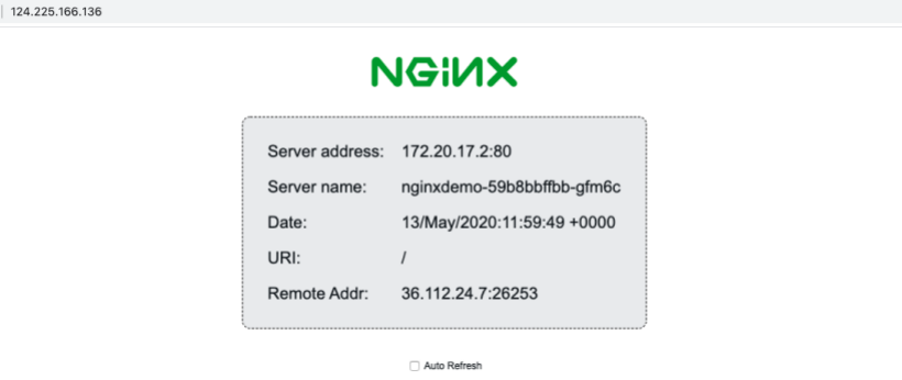在浏览器上访问该公网IP地址,验证容器是否发布成功。显示如下页面,标明容器发布成功: