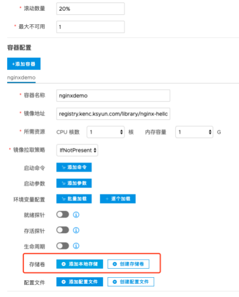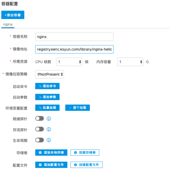 填写容器配置,包含容器名称、镜像地址、所需资源等,本次显示使用的镜像是registry.kenc.ksyun.com/library/nginx-hello:latest