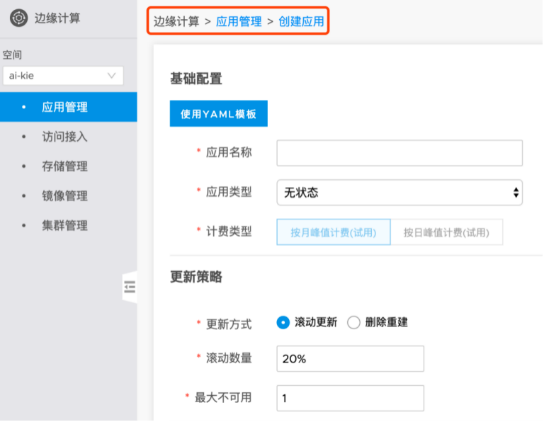 在KENC控制台的边缘容器中选择应用管理,点击“创建应用”,进入到应用模板编辑页面。