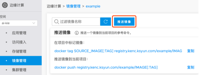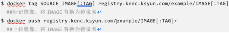 之后上传镜像,依次执行以下命令,即将镜像上传至之前创建的“example”镜像仓库中,如下图所示: