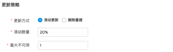 填写更新策略(指Pod滚动更新的占比以及最大不可用Pod数)。