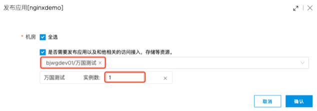 应用模板创建完成后,需要在对应的边缘节点进行发布操作,即可在指定的节点上创建容器。点击应用模板列表右侧的“发布”按钮,指定边缘节点以及实例数(Pod数量),进行应用发布操作。