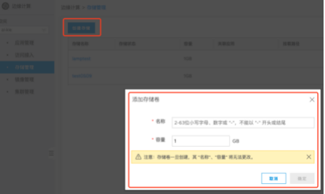 如果客户的业务中需要本地持久化存储,可以通过KENC的存储管理模块创建,并在应用模板中实现存储卷的关联,即可保证Pod成功调度到该存储卷;也可以在创建应用模板时,同步创建存储卷并完成关联操作。本地持久化存储卷一经创建不可变更名称及存储空间。下图为在存储管理模块创建存储卷。此处建设创建名为Demo的存储卷。