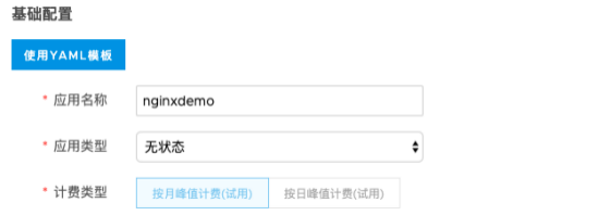 填写应用的基础配置,包含应用名称、应用类型(有状态:状态副本集;无状态:部署)。